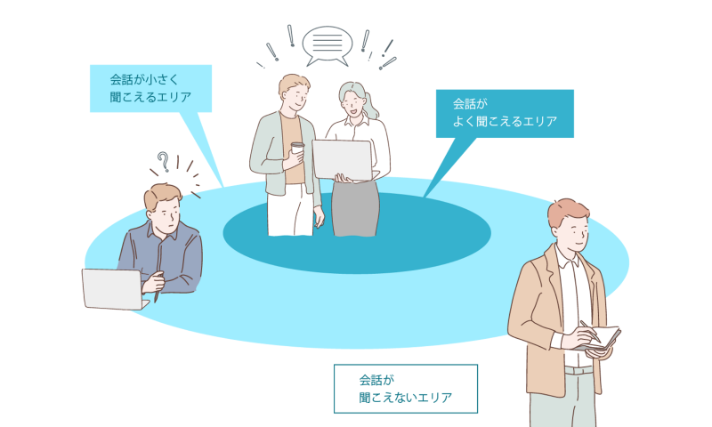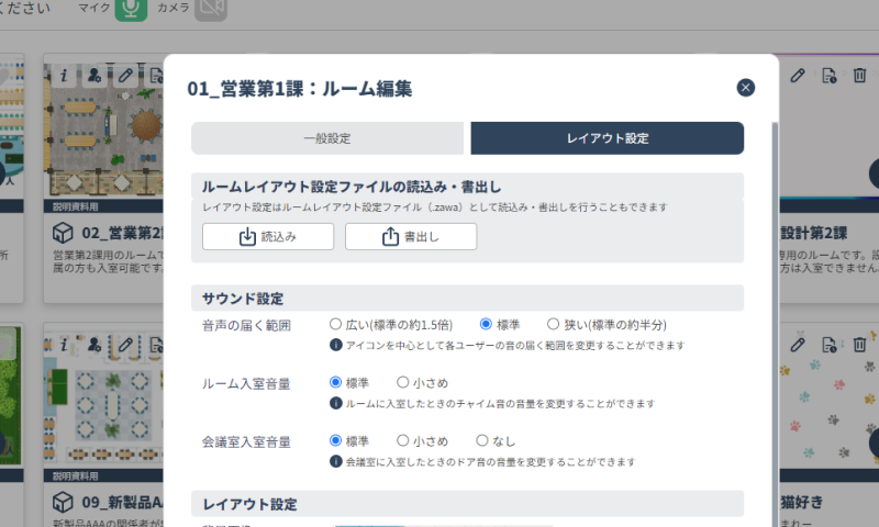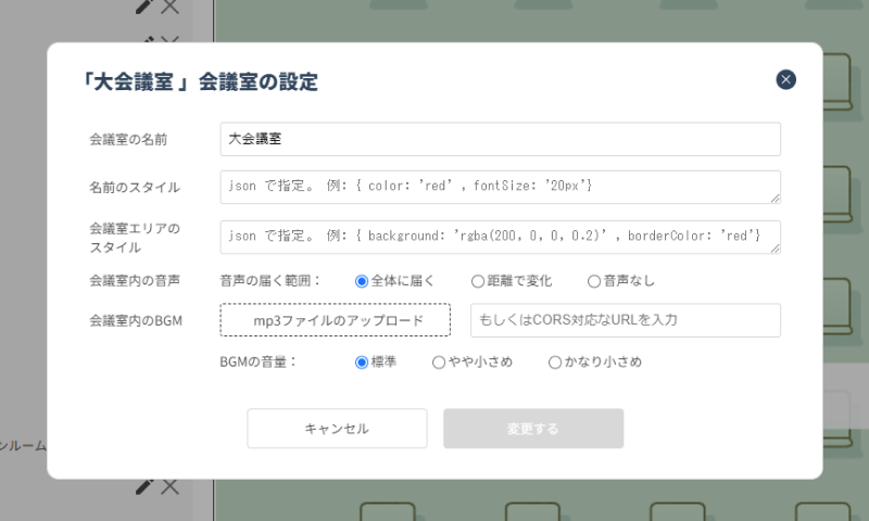 ルーム内には自由に会議室を配置できますが、各会議室ごとに声の届く範囲やBGMの有無などをカスタマイズすることもできます。