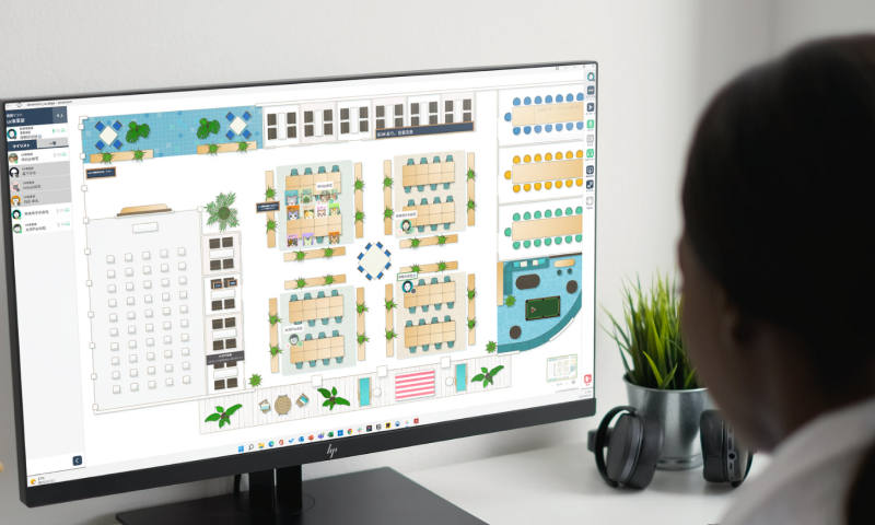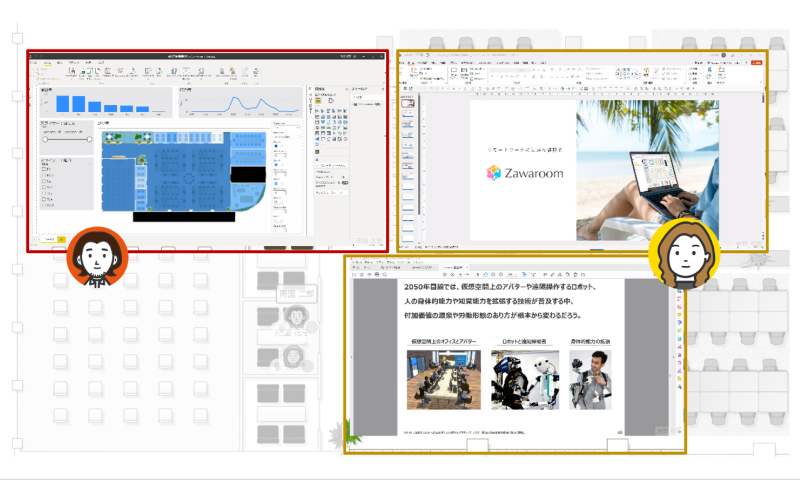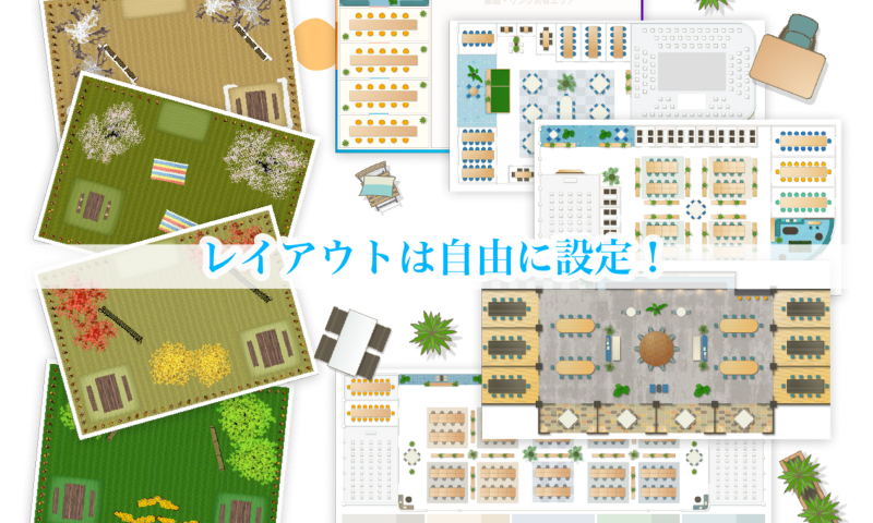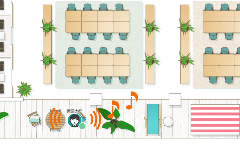 ルームの背景だけでなくルーム内の会議室レイアウトもご利用者自身で自由に設定することができます。声の届く範囲などもカスタマイズ可能です。