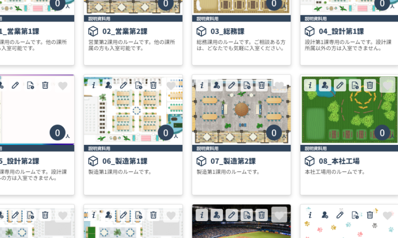 ルームを使いやすくするため、ふせんや看板、画像などを誰でも配置できます。配置場所や視認範囲なども自由に設定できます。