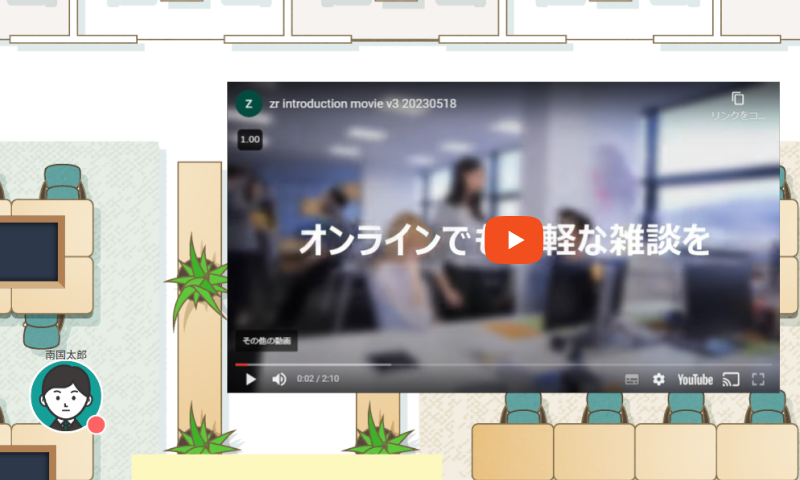 YouTubeなどの動画をルーム内に配置することができます。再生・停止などはユーザーごとに好きなタイミングで操作可能です。