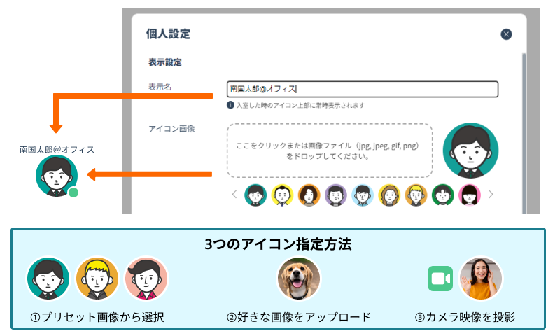 自分自身のアイコンには好きな画像を設定することができます。静止画だけでなくカメラ映像を映すこともできます!